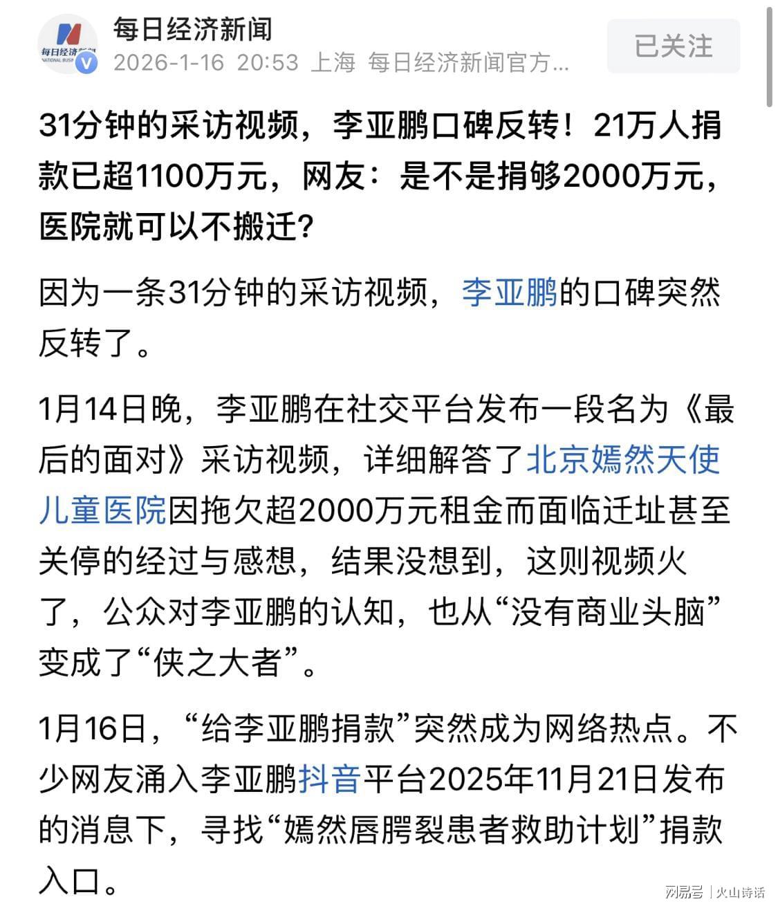1月16日,“给李亚鹏捐款”突然成为网络热点。不少网友涌入李亚鹏抖音平台2025年11月21日发布的消息下,寻找“嫣然唇腭裂患者救助计划”捐款入口。