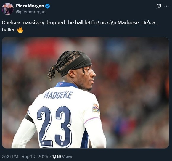 9月10日讯 英国名嘴、阿森纳拥趸皮尔斯-摩根在推特晒照,称赞马杜埃凯。